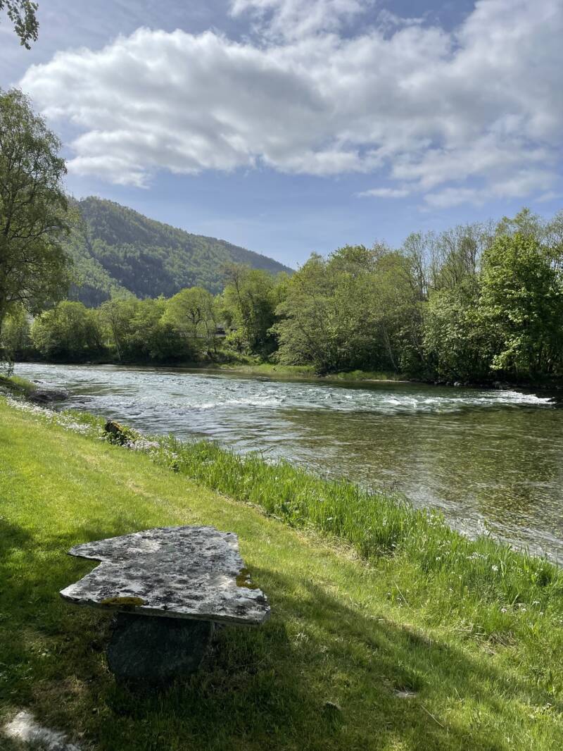 Die Hütten befinden sich auf Skipenes gard in Nordfjordeid, der idyllisch direkt am Lachsfluss Eidselva liegt. Skipenes gard bietet auch Lachsangeln an und macht das seit vielen Jahren, aber dieses Jahr ist der Fluss leider für das Angeln gesperrt.